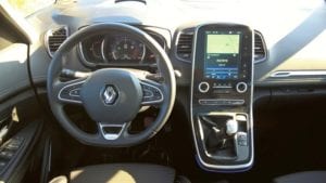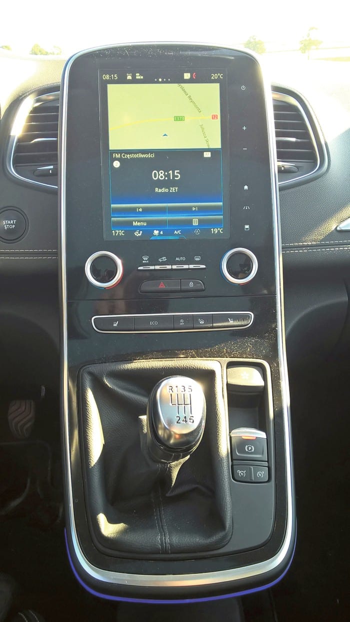 Kabina Scenica została zbudowana z dość twardych plastików. Mają one co prawda przyjemną w dotyku fakturę, ale nie zmienia to faktu, że nie pochodzą z najwyższej, a nawet średniej półki. Czuć, a właściwie słychać to na dużych nierównościach. Wtedy do naszych uszu docierają charakterystyczne „świerszcze”, stuki, puki i skrzypienia. Pod tym względem poprzednia generacja tego auta była o wiele lepiej dopracowana. Jeśli jesteśmy przy wadach, nie sposób nie wspomnieć o braku możliwości manualnego sterowania podstawowymi funkcjami samochodu, takimi jak moc nawiewu, czy głośność radia – tu wszystko odbywa się za pomocą dotykowego wyświetlacza. Z drugiej strony są osoby, którym to pasuje – wszystko zależy od upodobań. Za to zdecydowana większość użytkowników Scenica doceni jego walory artystyczne, czyli wygląd kabiny. Tu nawet najwięksi malkontenci będą mieli trudności, by znaleźć jakiś brzydki, czy niepasujący do całości element. Jednym słowem jest ładnie – pięknie prezentuje się deska rozdzielcza, której głównym elementem jest wygięty panel z obudową z fortepianowego plastiku, w który wkomponowano wyświetlacz, panel sterowania klimatyzacją, czy lewarek zmiany biegów. Przy nim zamontowano też przyciski do obsługi tempomatu, hamulca postojowego oraz do zmiany parametrów samochodu, czyli tzw. Multisense, za pomocą którego możemy wybrać jeden z 5 trybów jazdy. Bardzo fajna jest kierownica o ściętym dole, świetnie prezentują się wirtualne zegary z możliwością zmiany wyglądu, rewelacyjne wrażenia sprawia też podświetlenie niektórych elementów kabiny. Miejsca zarówno z przodu, jak i z tyłu jest pod dostatkiem.