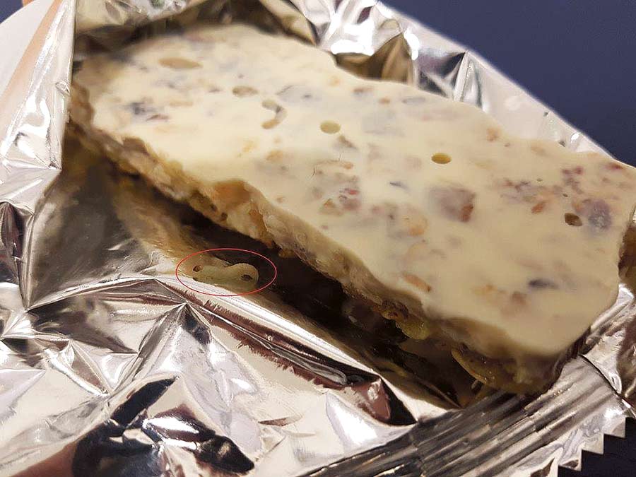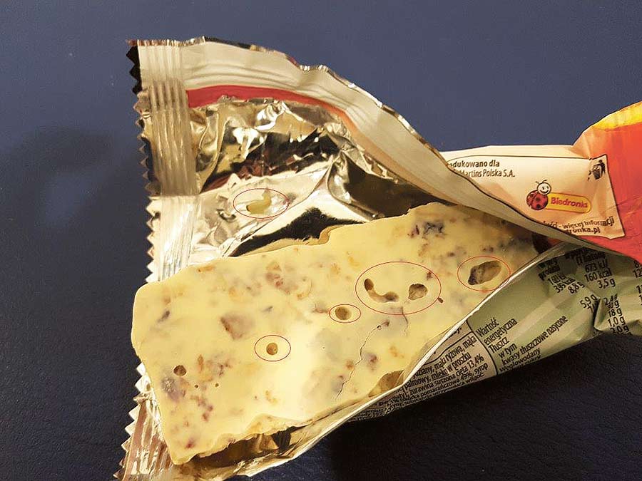 – Obrzydliwe, wstrętne, skandaliczne – naszemu Czytelnikowi brak słów, aby skwitować to, jak poczuł się wgryzając się w baton usiany jajeczkami larw. Mogło być gorzej, bo po rozpakowaniu drugiej słodkości, zakupionej w „Biedronce”, wypełzł dorodny, tłusty robak. – Dobrze, że zdążyłem wypluć i nie pogryzłem – mówi chełmianin. Sieć nie wycofała ze sprzedaży pozostałych batonów z tych partii, bo nie znalazła do tego podstaw.