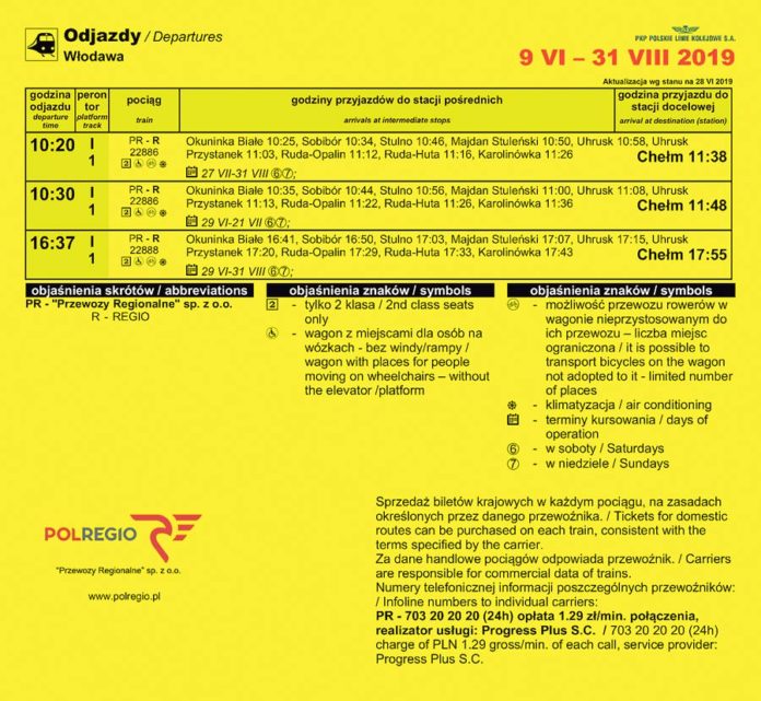 Pociąg przewozów regionalnych jeździ wyłącznie w soboty i niedziele. Kursuje dwa razy dziennie – rano i po południu. Z dworca głównego w Chełmie odjeżdża o godzinie 7.39 i 15.02, a z Włodawy do Chełma o godz. 10.30 i 16.37.