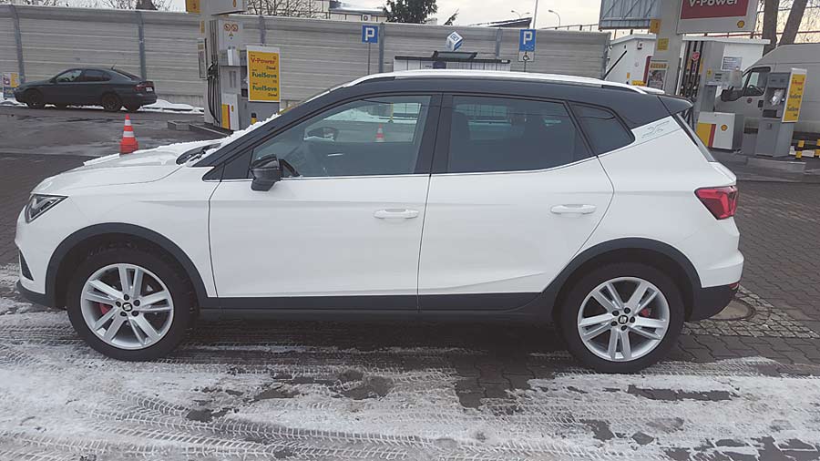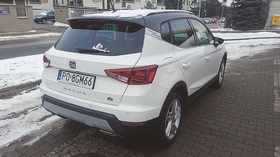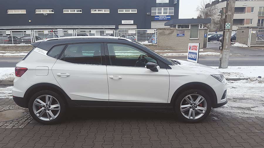 Arona to najmniejszy crossover w gamie Seata. Z zewnątrz prezentuje się bardzo atrakcyjnie. To zasługa nie tylko dość oryginalnych w klasie kształtów, ale przede wszystkim zestawienia dwóch kolorów nadwozia, gdzie perłowy lakier kapitalnie kontrastuje z czarnym dołem i dachem. O tym, że jest to odmiana FR informują nas o tym wszędobylskie emblematy z tymi właśnie literami. Całość świetnie uzupełniają fajne felgi oraz srebrne relingi.