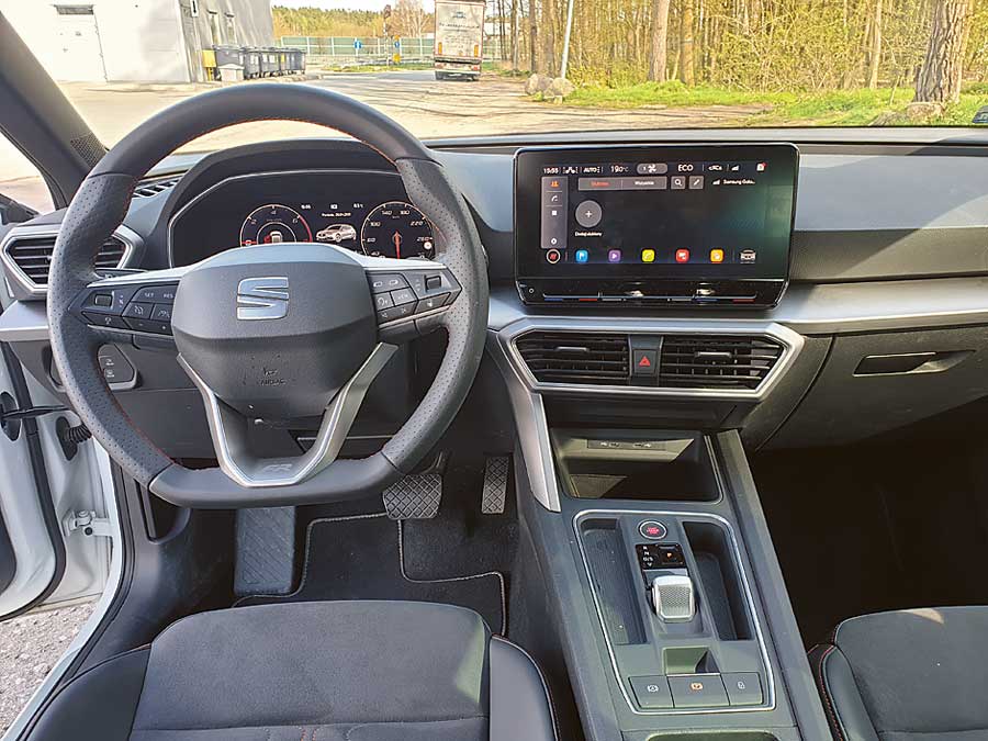 W testowym Leonie znajdziemy dwa silniki: pierwszy benzynowy o pojemności 1,4 l i mocy 150 KM oraz elektryczny. W sumie kierowca ma do dyspozycji 204 KM i aż 350 Nm maksymalnego momentu obrotowego. Co to oznacza w praktyce? Duuużo frajdy, bo Seat przyspiesza do setki w 7,5 sekundy, a elektryczne doładowanie jest dostępne w każdym momencie. Spokojna jazda oznacza oszczędności. W trybie bezemisyjnym można przejechać ok. 50 km, więc do pracy i z powrotem powinno wystarczyć. Normalna jazda w trybie mieszanym jest okupiona zużyciem benzyny w okolicach 6 litrów na 100 km. Napęd jest przenoszony na przód za pośrednictwem 6-stopniowej przekładni automatycznej DSG.