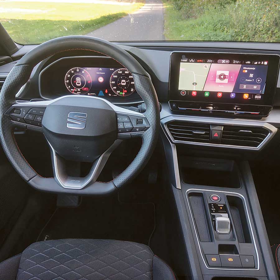 Najtańszy Leon kosztuje niecałe 70 tysięcy. Centy wersji FR z automatyczną skrzynią, czyli taką, jak nasza testówka, zaczynają się od 101 500 zł. Co znalazło się na jej pokładzie? Bardzo dużo. Mamy trzystrefową klimatyzację, nawigację, wirtualny kokpit, adaptacyjne zawieszenie i takiż tempomat, zestaw czujników i kamer, kilka elektronicznych asystentów bezpieczeństwa, wielofunkcyjną kierownicę czy 18-calowe koła.