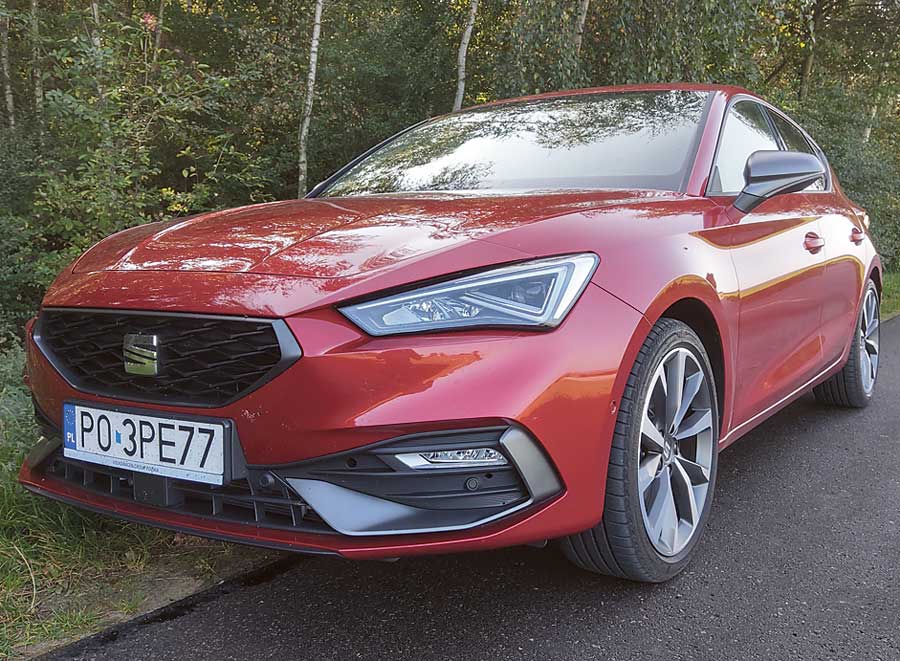 Po co kupować Leona, skoro to niemal to samo auto co Golf lub Octavia? Z jednego oczywistego względu – Seat nie jest tak nudny i przewidywalny jak wyżej wymieniona dwójka. Owszem, jest nieco gorzej wyposażony, nie ma tak mocnej wersji jak chociażby Golf R, ani bagażnika jak Skoda, ale ma coś zdecydowanie ważniejszego: charakter. Do gustu przypadł nam przede wszystkim tył z przebiegającą przez całą szerokość klapy bagażnika świetlną listwą łączącą lampy. Przód z długą maską przypomina bardzo najnowsze konstrukcje Mazdy, ale absolutnie nie jest to zarzut. Karoserię w krwistoczerwonym kolorze osadzono na 18-calowych felgach, więc całość prezentuje się naprawdę godnie.