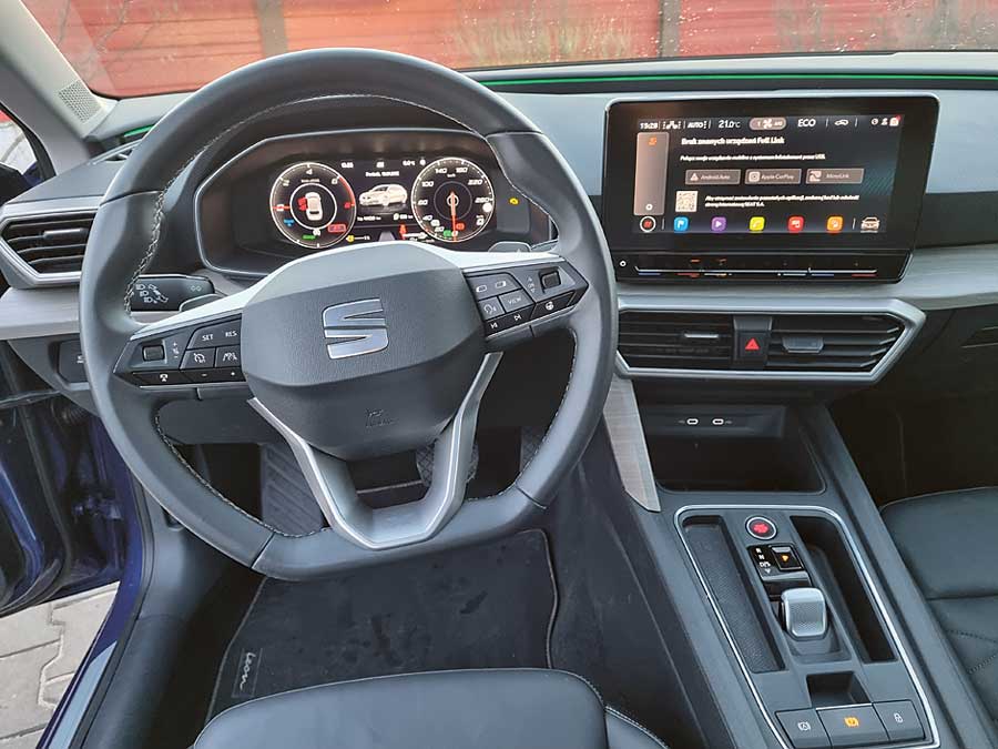 Wnętrze Leona ma wiele cech wspólnych z ostatnim Golfem, jak chociażby dotykowy włącznik świateł i wirtualne zegary, ale deskę rozdzielczą i np. boczki drzwi tak przemodelowano, że tego podobieństwa tak bardzo nie czuć. Centralnym elementem kabiny jest wielki wyświetlacz pełniący rolę centrum zarządzania samochodem. Ma bardzo fajny i przejrzysty interfejs, ale brakuje fizycznych przycisków chociażby skrótowych. Mniejszy wyświetlacz znajduje się w miejscu zegarów. Można oczywiście zmieniać jego wygląd i funkcje, które wyświetla. Świetne są fotele z niską, ale bardzo wygodną pozycją za kierownicą, miejsca z tyłu jest całkiem sporo nawet na nogi, więc czwórka dorosłych będzie podróżować wygodnie. Bagażnik ma pojemność 470 litrów.