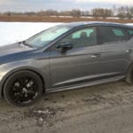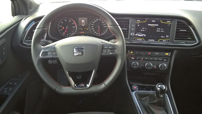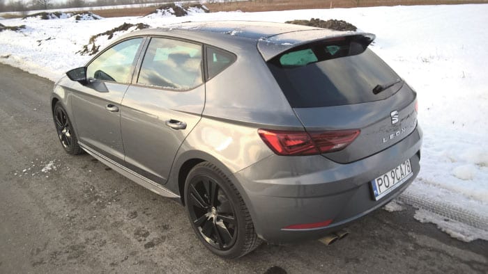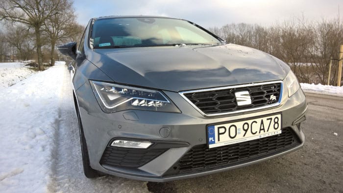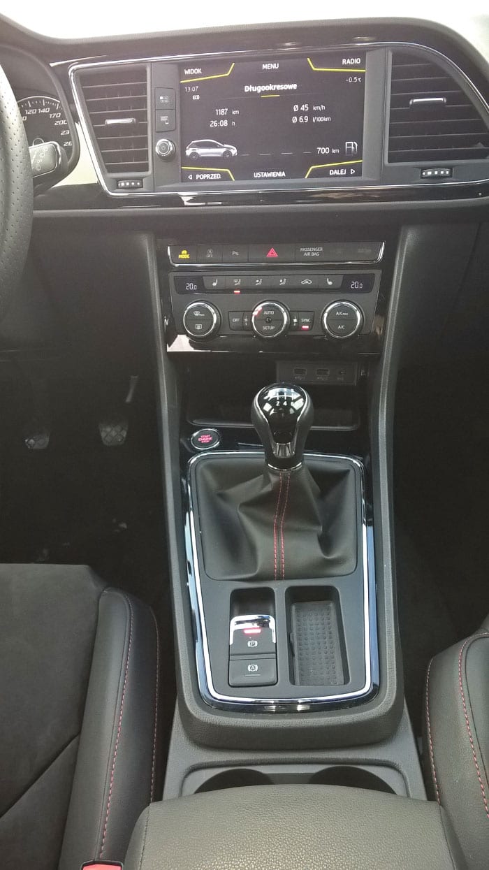 Zdecydowane, ostre kształty, zwarta sylwetka i agresywny pas przedni Leona prezentują się kapitalnie. Podobnie jak podwójna końcówka wydechu, napompowany zderzak, spojler i tylne lampy podkreślone dodatkowo ostrym przetłoczeniem. Dlatego trochę rozczarowuje wnętrze, w którym nie jest już tak sportowo. Pod względem spasowania i jakości zastosowanych materiałów jest nieźle. Kokpit Seata to wzór prostoty – czarna deska rozdzielcza jest podzielona na dwie części – w górnej mamy „volkswagenowski” wyświetlacz nawigacji, radia, telefonu i ustawień samochodu, niżej zaś tradycyjny panel do sterowania klimatyzacją. Trójramienna kierownica ma idealną wręcz grubość wieńca i charakterystyczną, wypukłą część środkową oraz ścięty dół. Wszystko to razem nie tylko fenomenalnie leży w dłoniach, ale też i świetnie wygląda. Zegary są do bólu proste i czytelne. Rozdziela je kolorowy wyświetlacz, na którym pojawiają się wszystkie informacje potrzebne (i nie tylko) kierowcy. Słowa uznania należą się Leonowi za kapitalne fotele – głębokie, okalające ciało siedziska świetnie trzymają w zakrętach, a obszycie z czerwonej nici świetnie wygląda.