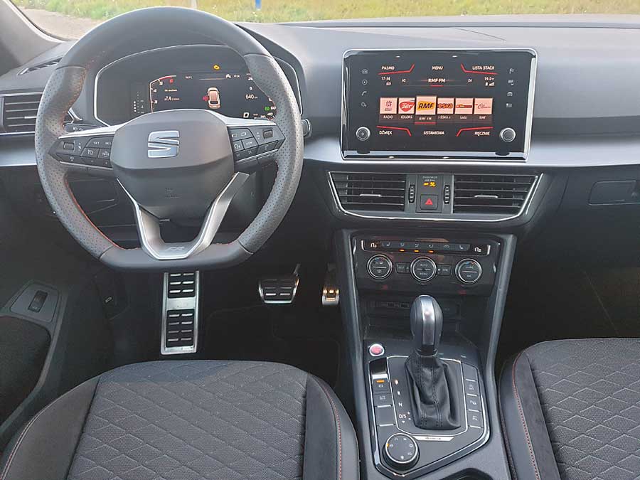 Cały kokpit urządzony jest dość skromnie, ale gustownie. W Seacie nie ma już tradycyjnych zegarów. Wyparł je wyświetlacz ciekłokrystaliczny, który można sobie spersonalizować. Co się nie wyświetli na nim, znajdziemy na ekranie centralnym. Jego największymi zaletami są wielkość oraz pozostawienie fizycznych pokręteł do sterowania radiem. Świetne są kubełkowe podgrzewane fotele pokryte alcantarą. Bagażnik ma imponującą pojemność 760 litrów.