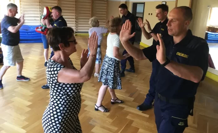 dowiadywali się i ćwiczyli możliwe scenariusze, seniorzy pod okiem czterech strażników. Przewodził w tych zajęciach Michał Czubacki – wykwalifikowany instruktor taekwon-do ITF, instruktor Krav Maga i kickboxing, medalista Mistrzostw Polski i uczestnik Pucharu Świata w tych dyscyplinach. Jednak do generalnych zasad samoobrony trzeba zaliczyć: unikanie miejsc ryzykownych, szybkie ich opuszczenie, korzystanie z otaczających sprzętów, by sobie ułatwić ucieczkę lub obronę, posiadanie takich akcesoriów jak gaz defensywny – podkreślał trener. – Dopiero wówczas nasz organizm decyduje: ucieczka albo walka.