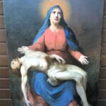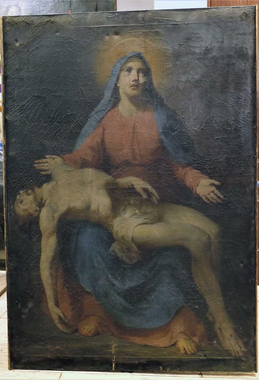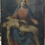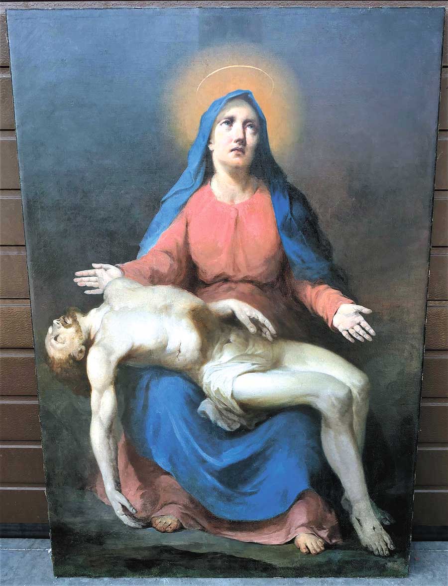 Obraz ma wymiary 128 cm na 88 cm, został namalowany w technice olejnej na płótnie w XIX w. – Kompozycja przedstawia siedzącą postać Matki Bożej w ujęciu en face, trzymającą na swoich kolanach martwe ciało Jezusa Chrystusa, które bezwładnie opada ku ziemi. Stan zachowania obrazu był bardzo zły. Widoczne były liczne przetarcia i ubytki malatury oraz wykruszenia i spękania powierzchniowe warstwy malarskiej. W dolnej partii obrazu rozdarcie płótna.