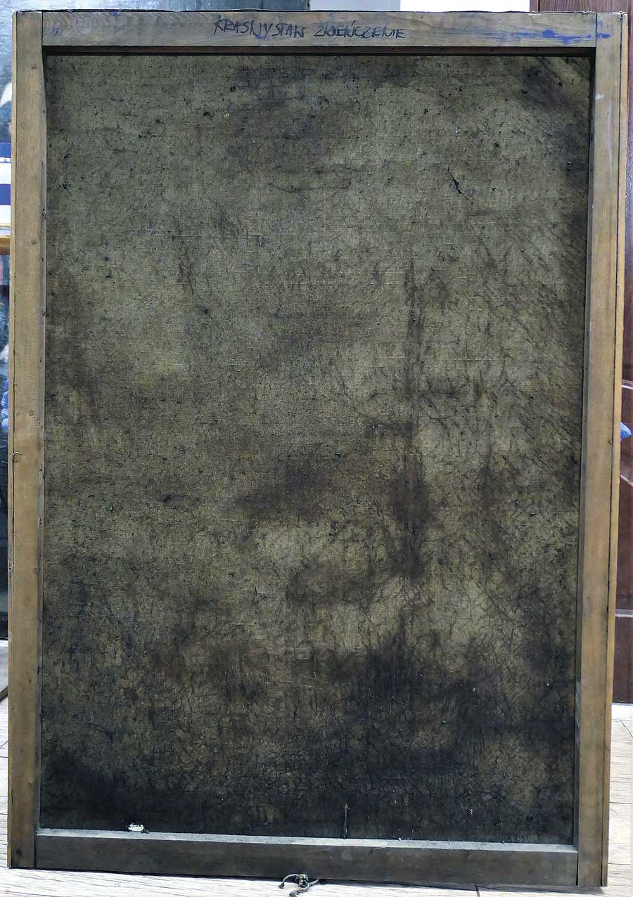 Ze względu na zły stan zachowania zabytku podjęto decyzję o przeprowadzeniu zabiegów konserwatorskich w pełnym zakresie, tj. wykonanie konserwacji technicznej i estetycznej – informuje WIra. Po demontażu obrazu z ołtarza i zdjęciu z krosien wykonano wstępne oczyszczenie zabytku z kurzu i brudu. Następnie oczyszczono lico z brudu, a także usunięto pociemniały werniks. Wykonano prasowanie pofalowanego płótna na stole niskociśnieniowym oraz zdublowano obraz na nowe płótno. Uzupełniono ubytki zaprawy kitami.