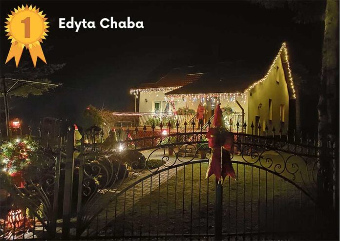 I miejsce (nagroda pieniężna w wysokości 400 zł) – Edyta Chaba (Uzasadnienie: Całość dekoracji tworzy niezwykle uroczą kompozycję świateł, świątecznych ozdób i stroików, czerwonych lampionów, w większości wykonanych własnoręcznie. Dekoracja budynku, ogrodu, ogrodzenia, drzew i krzewów, niezwykła dbałość o detale sprawiają, że posesja przypomina bajkowe miejsce).