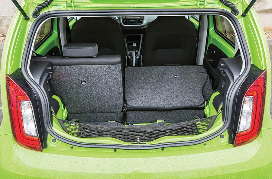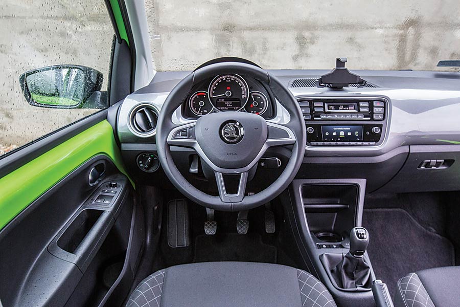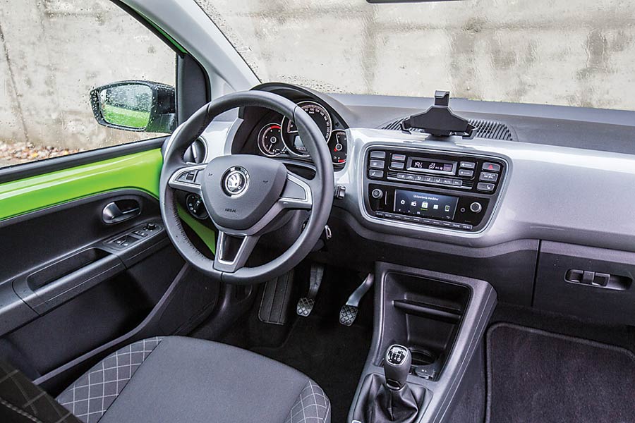 Z zewnątrz czeski maluch prezentuje się całkiem nieźle. Krótka, ostro opadająca maska, duże reflektory oraz masywny zderzak bez zbędnych przetłoczeń – przód małej Skody to wzór prostoty, ale w dobrym stylu. Na masce mamy logo marki, a tuż pod nim czarną atrapę chłodnicy z pionowo ustawionych żeberek. Napompowany do granic możliwości tylny zderzak i malutka klapa bagażnika z jeszcze mniejszą szybką wyglądają dość oryginalnie, ale trzeba przyznać, że taki zabieg sprawia, że autko wygląda na dużo większe. Ma to i jednak złą stronę, bo przez wysoki próg załadunku znacznie obniża się funkcjonalność auta. Dla nas bezsprzecznie największą zaletą małej Skody jest jej uniwersalność. To auto dla każdego. Jest tylko jeden warunek – ten samochód musi służyć do jazdy po mieście i jego najbliższych okolicach. Jednak to, co najlepsze, mała Skoda skrywa wewnątrz. Mowa o wprost niesamowitych ilościach wolnego miejsca wygospodarowanego w środku tak niewielkiego pojazdu. Tym autem bez najmniejszych przeszkód podróżować mogą 4 osoby i żadna z nich nie powinna narzekać. Miejsca nie brakuje zarówno na nogi, jak i nad głowami pasażerów, a do tego do dyspozycji pozostaje bagażnik o pojemności 251 litrów, który w klasie daje Skodzie palmę pierwszeństwa. Po złożeniu tylnej kanapy przestrzeń bagażowa rośnie do aż 959 litrów. Na słowa uznania zasługuje również staranne wykonanie całej kabiny. Materiały użyte do jej wykończenia, mimo iż nie najwyższej jakości, są bardzo dobrze spasowane. Deska rozdzielcza ogranicza się jedynie do niewielkiego panelu w kształcie odwróconego trapezu, na którym znajduje się radio oraz sterowanie klimatyzacji. Poniżej wygospodarowano zaś miejsce na kubek oraz niewielką półkę. W duchu minimalizmu zaprojektowano również zegary schowane pod półokrągłym daszkiem. Duża tarcza prędkościomierza pośrodku, po jej lewej stronie mikroskopijny obrotomierz, a po prawej identycznych rozmiarów wskaźnik poziomu paliwa. Na to wszystko kierowca spogląda przez dużą, obszytą skórą kierownicę, która całkiem przyjemnie leży w dłoniach.