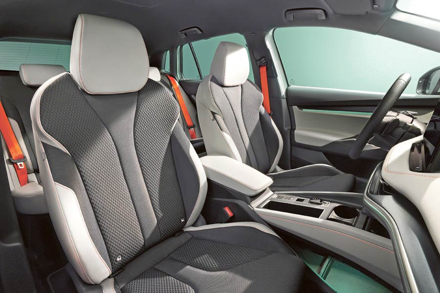 Jasnoszare sztuczne skóry, czarna podsufitka i pomarańczowe detale podkreślają nowoczesność, oferując jednocześnie trwałość i wyjątkowy styl. Design Selections Sportline wyróżnia się dominującą czernią, obejmującą także podsufitkę, co podkreśla sportowy charakter. Przednie sportowe fotele zintegrowane z zagłówkami, również w kolorze czarnym, wykonane są z Suedii i sztucznej skóry, uzupełnione szarymi kontrastowymi szwami. Wersja Sportline modelu Elroq pojawi się na rynku w pierwszym kwartale 2025 roku.