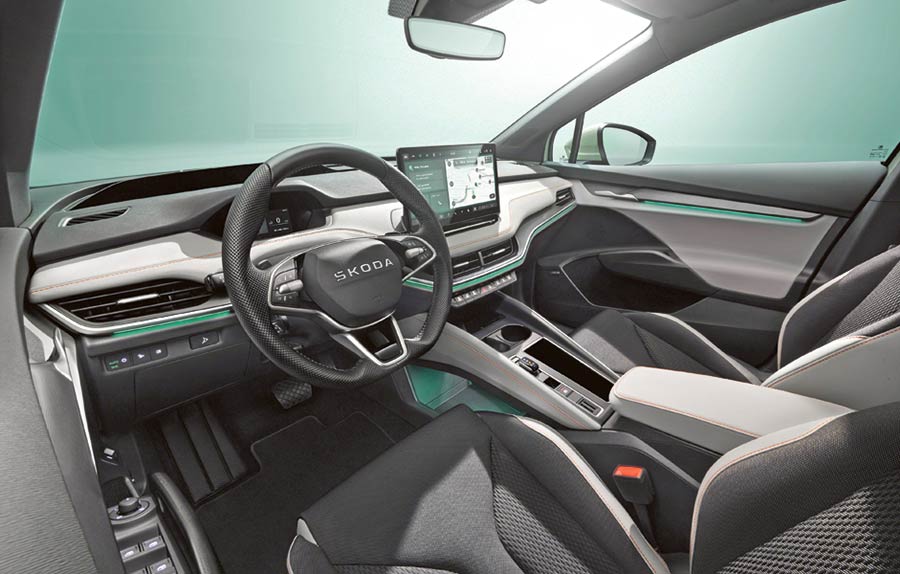 Wnętrza Skody Elroq łączą innowacyjne, zrównoważone i trwałe materiały z estetyką i komfortem. Podstawowa wersja Design Selections Studio charakteryzuje się minimalistycznym stylem i czarną materiałową tapicerką, zapewniając prostotę i funkcjonalność. Wariant Design Selections Loft wprowadza świeżość dzięki antracytowej szarości i akcentom w kolorze Moss Green, a materiały RecyTitan, zawierające 78% przetworzonego PET, wykorzystano także w panelach drzwiowych i desce rozdzielczej. Wersja Design Selections Lodge, inspirowana modelem Skodą Vision 7S, wykorzystuje materiał TechnoFil z przędz ECONYL®, powstających z odpadów nylonowych, takich jak sieci rybackie czy stare dywany.