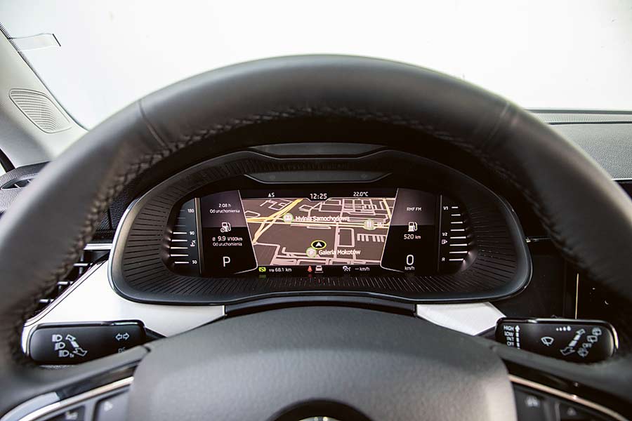 Atutem jest też minimalistyczna i bardzo powściągliwa w formie deska rozdzielcza, której centralnym punktem jest oczywiście ekran dotykowy. Występuje on aż w trzech wielkościach – wersja testowa miała zamontowany największy, ponad 9-calowy. Wszystkie jego wskazania można wyświetlić na ekranie za kierownicą, który zastąpił tradycyjne zegary. To rozwiązanie i wygodne, i bezpieczne. Jedynym mankamentem w ergonomii jest brak możliwości manualnego sterowania mocą nawiewów klimatyzacji – by to zrobić, trzeba wejść do menu i dopiero za pomocą wirtualnych suwaków ustawić interesującą nas pozycję – nie jest to ani wygodne, ani bezpieczne.