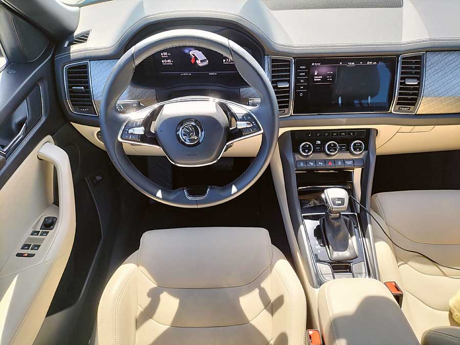 Miejsca nie zabraknie dla żadnego pasażera zarówno nad głowami, jak i na nogi. Zaskakuje kształt deski rozdzielczej, którą podzielono na dwa „piętra”. Górne zajmuje wielki ekran, po którego bokach umieszczono duże kratki nawiewów. Dolny panel, znany z innych modeli Skody, odpowiada za sterowanie klimatyzacją. Typowa dla Skody jest bardzo dobra jakość wykończenia i logiczna, intuicyjnie zrozumiała obsługa. Kierownica świetnie leży w dłoniach, a dodatkowo jest podgrzewana. Trójstrefowa klimatyzacja Climatronic, która ma dodatkowy panel obsługowy z tyłu samochodu, jest kolejnym elementem, który zwykle znaleźć można w wyższych klasach samochodów.
