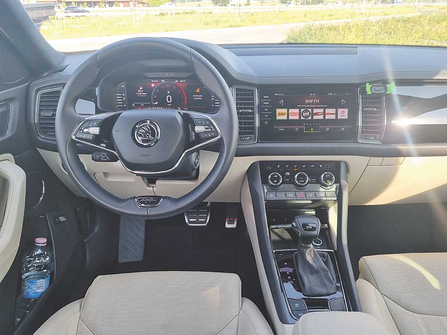 Miejsca nie zabraknie dla żadnego pasażera zarówno nad głowami, jak i na nogi. Zaskakuje kształt deski rozdzielczej, którą podzielono na dwa „piętra”. Górne zajmuje wielki ekran, po którego bokach umieszczono duże kratki nawiewów. Dolny panel, znany z innych modeli Skody, odpowiada za sterowanie klimatyzacją. Typowa dla Skody jest bardzo dobra jakość wykończenia i logiczna, intuicyjnie zrozumiała obsługa. Dwuramienna kierownica świetnie leży w dłoniach, a dodatkowo jest podgrzewana. Trójstrefowa klimatyzacja Climatronic, która ma dodatkowy panel obsługowy z tyłu samochodu, jest kolejnym elementem, który zwykle znaleźć można w wyższych klasach samochodów. Do tego mamy skórzaną tapicerkę, podgrzewane i wentylowane siedzenia w obu rzędach oraz wielki dach panoramiczny.
