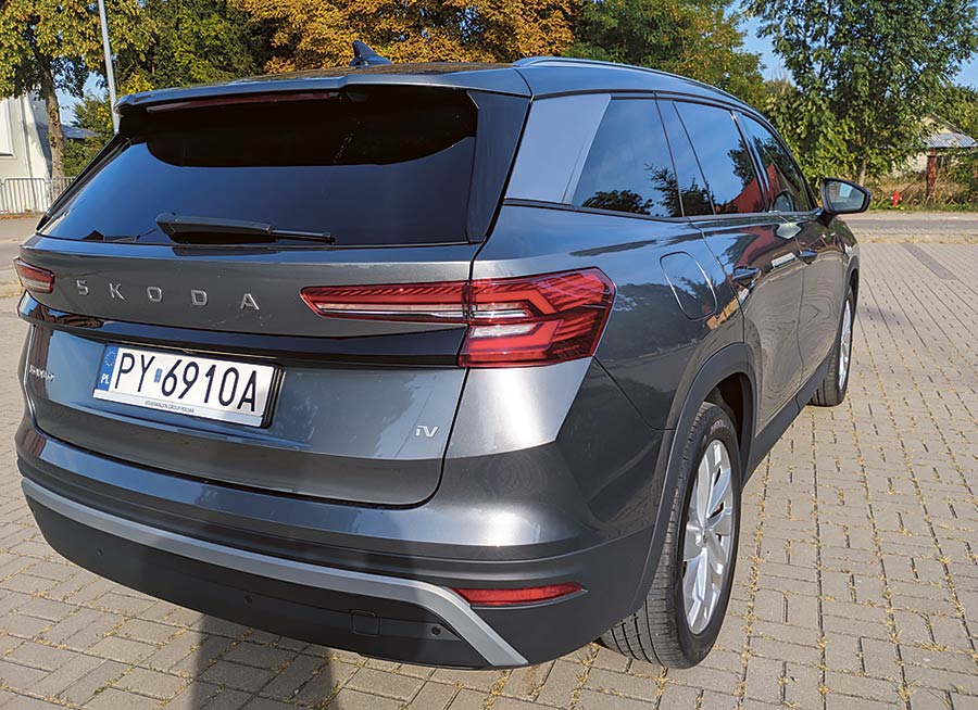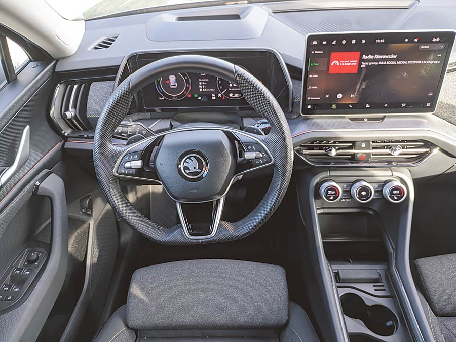Nadkola są ukształtowane lekko kanciasto. W lampach tylnych seryjnie zastosowano LED-y, tylne światła pozycyjne mają typowy dla Skody układ. Miejsca nie zabraknie dla żadnego pasażera zarówno nad głowami, jak i na nogi. Zaskakuje kształt deski rozdzielczej, którą podzielono na dwa „piętra”. Górne zajmuje wielki ekran, pod nim znajdziemy kratki nawiewów, a jeszcze niżej nowy panel sterowania głównymi funkcjami ukryty w trzech dużych pokrętłach, z których każde wyposażono w niewielki ekran ciekłokrystaliczny. System ten odpowiada już nie tylko za sterowanie klimatyzacją, ale również za sterowanie głośnością radia czy zmianę trybów jazdy.
