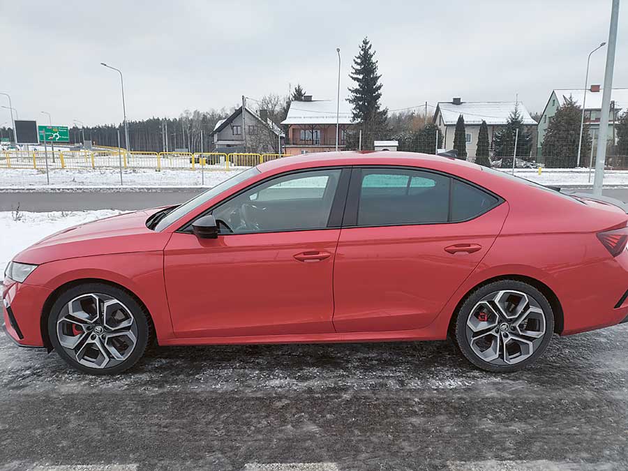 Wersja Octavii okraszona magicznym skrótem RS prezentuje się jeszcze bardziej efektownie, a robi to za sprawą dyskretnie podkreślonych detali w zderzakach, większym kołem, czy dużym spojlerem na końcu dachu. Czerwony lakier świetnie współgra z czarnymi wstawkami i z dymionym kolorem 19-calowych felg. Również wnętrze ma sportowy sznyt.