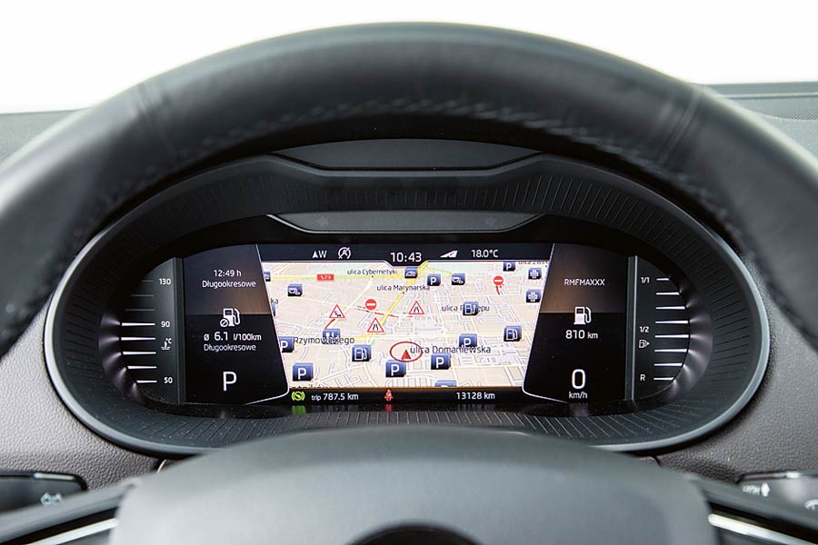 Wszystkie najczęściej używane przyciski trafiły na trójramienną kierownicę, przez którą mamy widok na dwie proste tarcze obrotomierza i prędkościomierza rozdzielone sporym wyświetlaczem. Niezmiennym atutem Octavii pozostaje jej kufer, do którego zapakować można aż 610 litrów bagażu, a po złożeniu oparcia tylnej kanapy aż 1740 litrów.