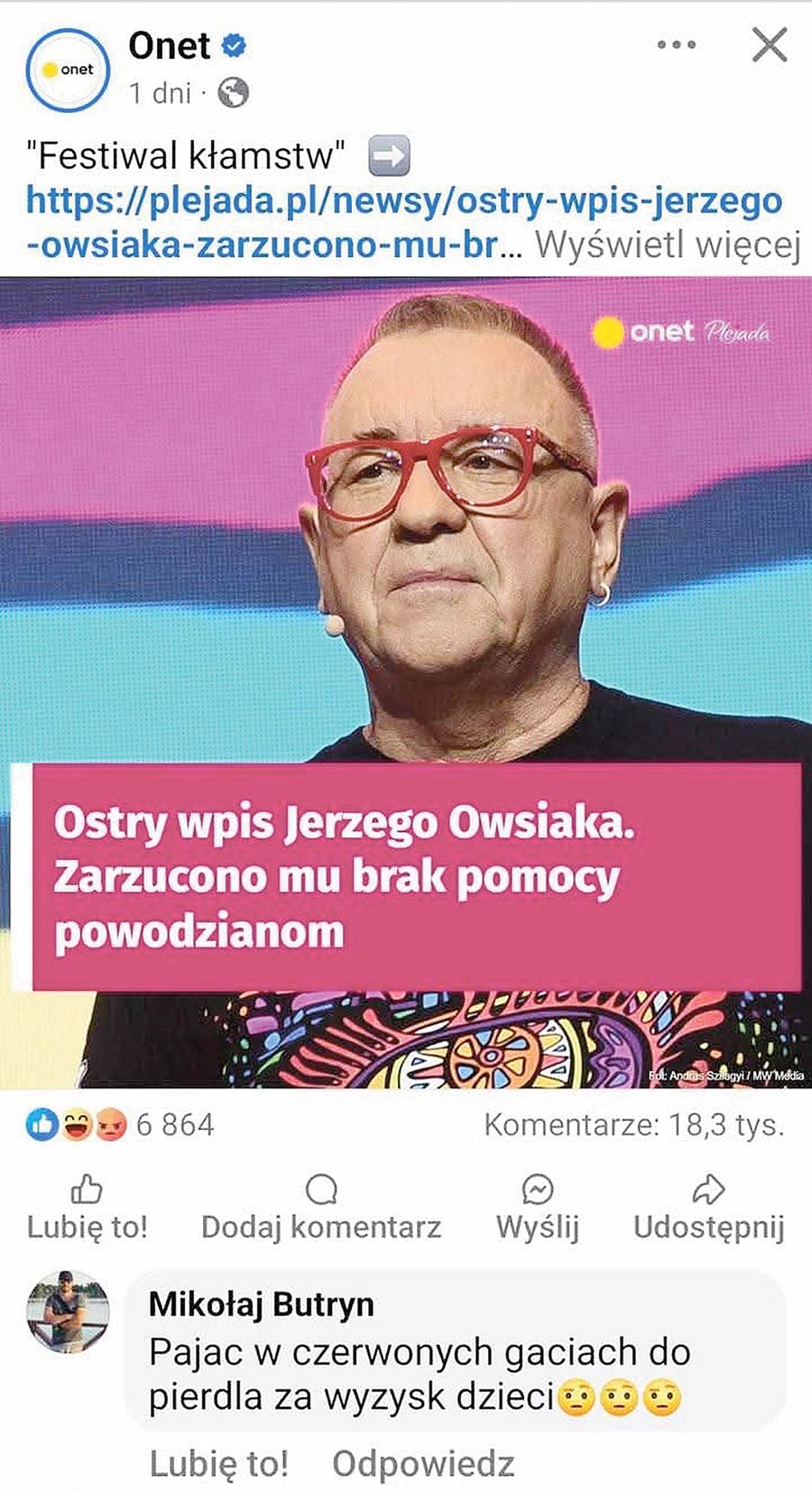 Mikołaj Butryn (55 lat) tak skomentował artykuł Onetu dotyczący szefa Wielkiej Orkiestry Świątecznej Pomocy: – Pajac w czerwonych gaciach do pierdla za wyzysk dzieci.