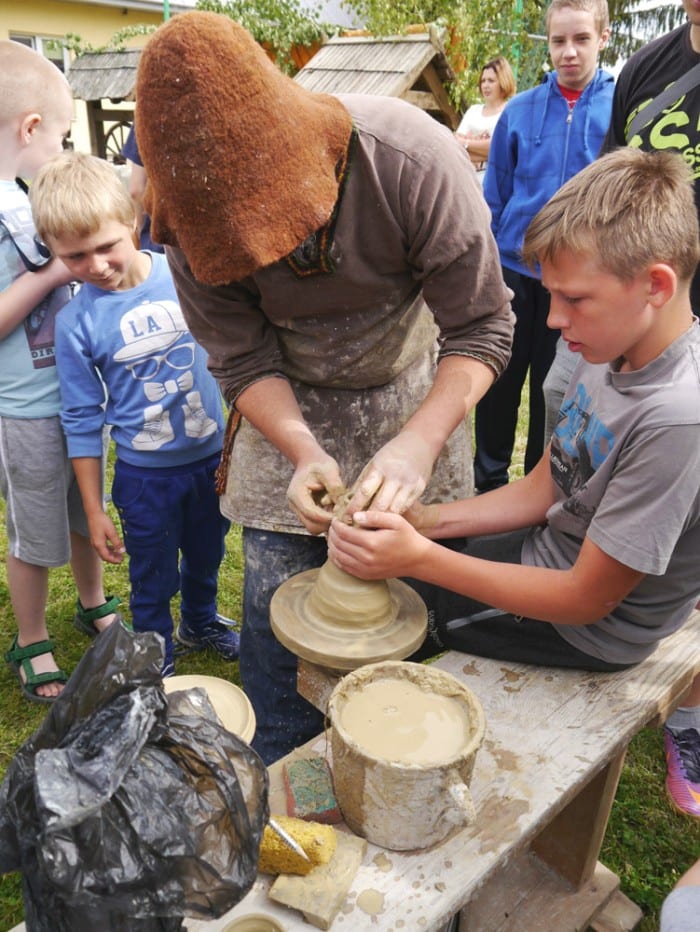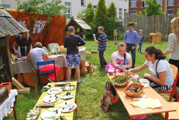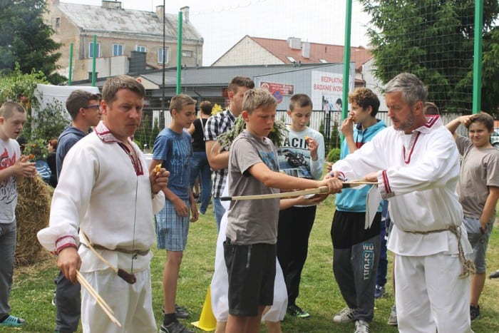 8 czerwca teren przy SOSW zamienił się w osadę słowiańską. – Cztery strzechy z wyposażeniem oraz palisada ochronna miała wprowadzić klimat starosłowiański. Na chwilę czas stanął w miejscu. Ta edukacyjna podróż miała przypomnieć uczestnikom i gościom spotkania o pochodzeniu naszych przodków – mówi Beata Korszla, dyrektor SOSW. Nauczyciele przygotowali sporo atrakcji dla zwiedzających. Były warsztaty, pokazy, zabawy i konkurencje sprawnościowe. Goście usłyszeli kilka legend słowiańskich oraz dowiedzieli się o zwyczajach i obrzędach Słowian. Mogli popróbować sił w warsztacie garncarza czy wikliniarza. Poznali technikę wykonywania papieru czerpanego. – Dziewczęta plotły wianki lub przygotowały piękne ozdoby w postaci bransoletek z koralików czy pasków ze skóry – mówi dyrektor Ośrodka. Klasy kucharskie przygotowały specjalnie na tę okazję palenisko słowiańskie, na którym wypiekane były bardzo smaczne podpłomyki. Dla bardziej żywiołowych i aktywnych uczestników przygotowano liczne konkurencje sportowe: strzelanie z łuku, toczenie beli słomy, przeciąganie liny czy rzucanie do celu. Wychowankowie z internatu wraz z wychowawcami przygotowali też przedstawienie pt. „Brzydkie kaczątko”. (kg)