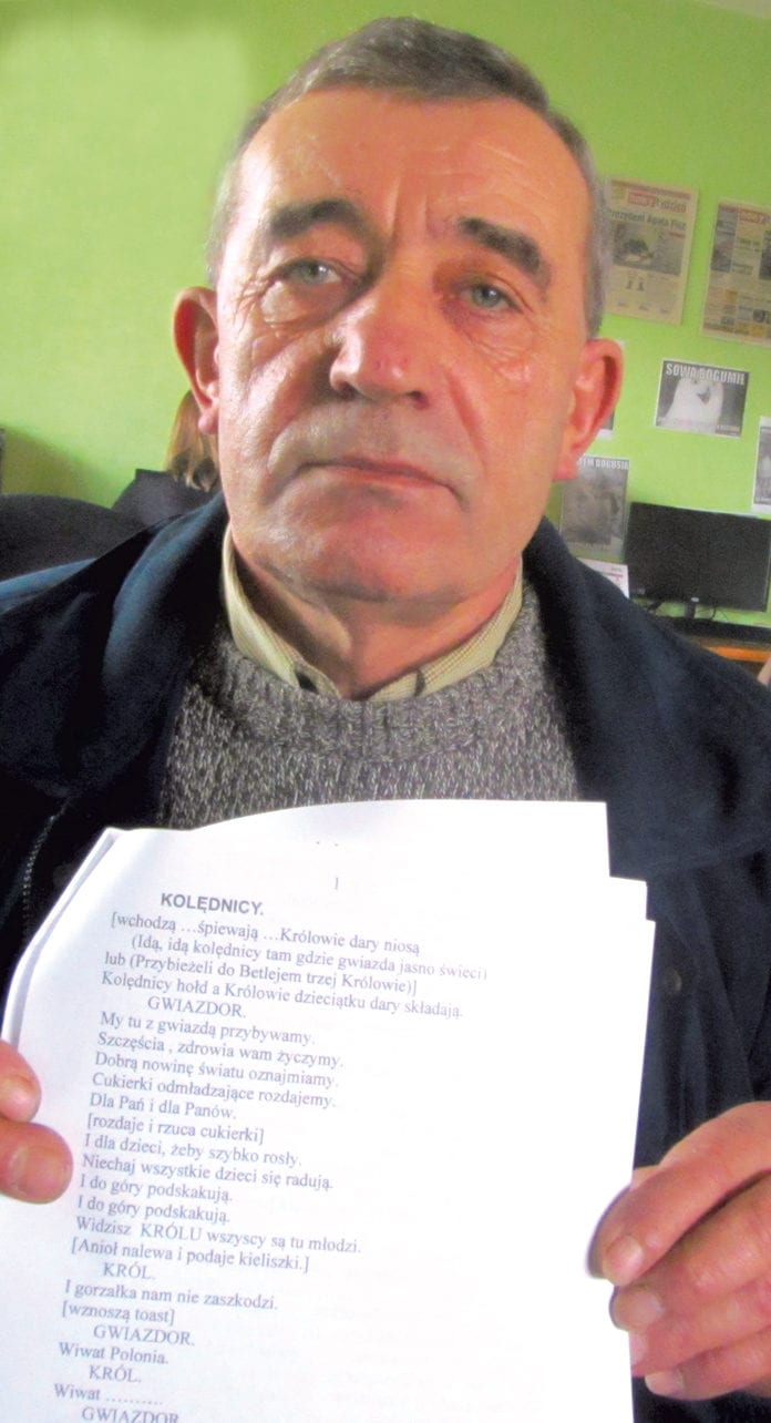 – To, co napisałem, siedziało we mnie od trzydziestu lat – mówi sołtys Dąbrowski. – Moja sztuka nawiązuje do różnych przepowiedni, także biblijnych. Są tam wątki religijne, a nie polityczne. Nie obraża to niczyich uczuć i nawet w świątyniach ta sztuka mogłaby być wystawiona. To półgodzinne przedstawienie, przypominające swym charakterem jasełka. Zależy mi, aby jakiś ośrodek kultury wystawił moją sztukę i pomógł mi ją zaaranżować. Chciałbym, aby ktoś potraktował ją poważnie i dał mi szansę się wykazać. (mo)