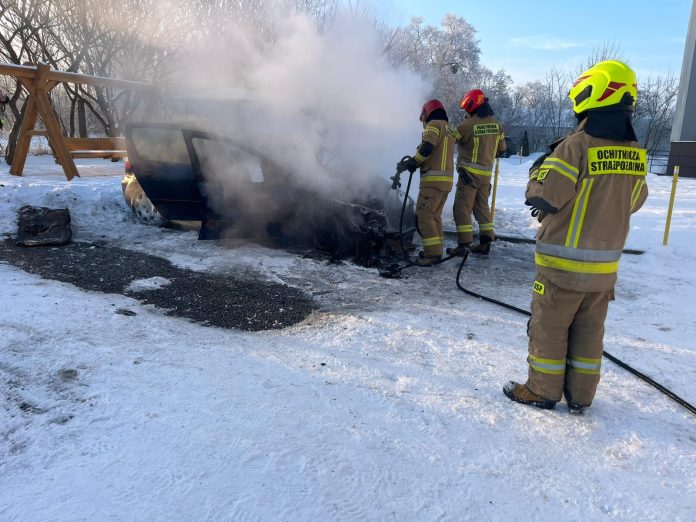 Auto spłonęło doszczętnie. Na szczęście nikomu nic się nie stało. Na miejscu szybko pojawili się strażacy z OSP z Sawina, którzy dogasili płonący samochód. reb, fot. OSP Sawin