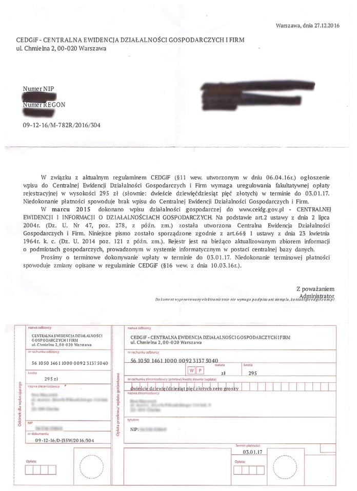 „W związku z aktualnym regulaminem CEDGiF (…) ogłoszenie wpisu do Centralnej Ewidencji Działalności Gospodarczych i Firm wymaga uregulowania fakultatywnej opłaty rejestracyjnej w wysokości 295 zł w terminie do 03.01.2017 r.” – wiadomość o takiej treści dostali niektórzy chełmscy przedsiębiorcy. Nadawcą jest CEDGiF z siedzibą przy ul. Chmielnej 2 w Warszawie.