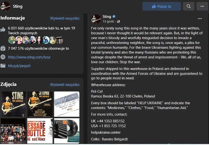 Apel o pomoc dla uchodźców z Ukrainy Sting zamieścił na swoim facebooku i instagramie w minioną sobotę. Pod postem opublikował nową, akustyczną wersję swojego utworu „Russians” z wydanej w 1985 r. płyty „The Dream of the Blue Turtles”. Poinformował też, żeby wysyłać paczki do organizacji, o której powiedziała mu reżyserka Małgorzata Szumowska. Okazało się, że jest to „Pol-Cel” Agencja i Magazyn Celny zlokalizowany przy ul. Rampa Brzeska 63 w Chełmie.