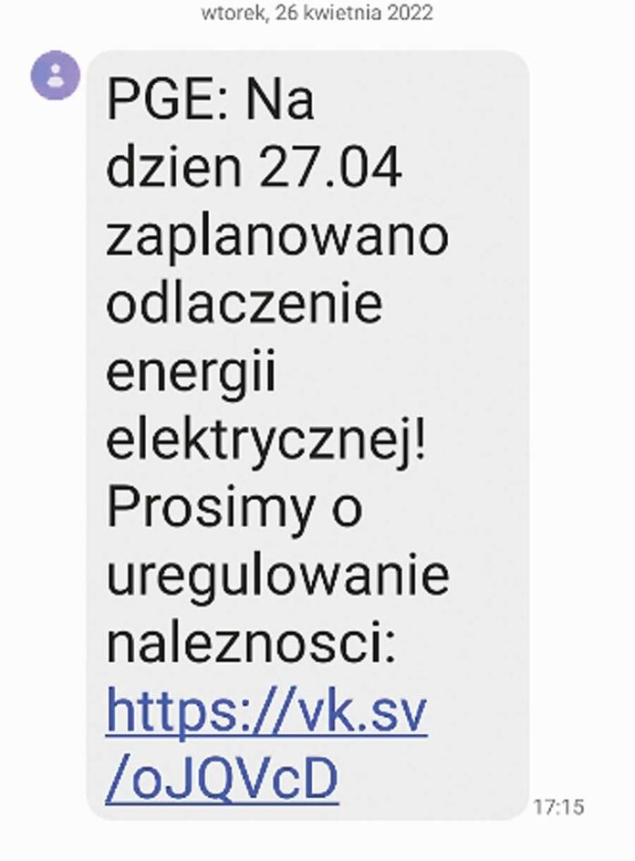 Wiadomość jest krótka i może sprawiać wrażenie autentycznego komunikatu Polskiej Grupy Energetycznej, pod którą podszywa się nadawca. Jak wynika z sygnału od naszej czytelniczki, może nadejść z numer 780 516 555. SMS zawiera informację o rzekomym zaplanowaniu wyłączenia prądu, jeśli odbiorca nie ureguluje należności. Ma to umożliwić dołączony do treści link, ale uwaga! To oszustwo.