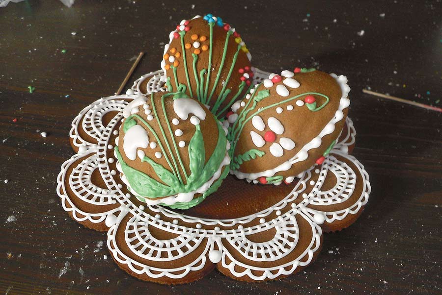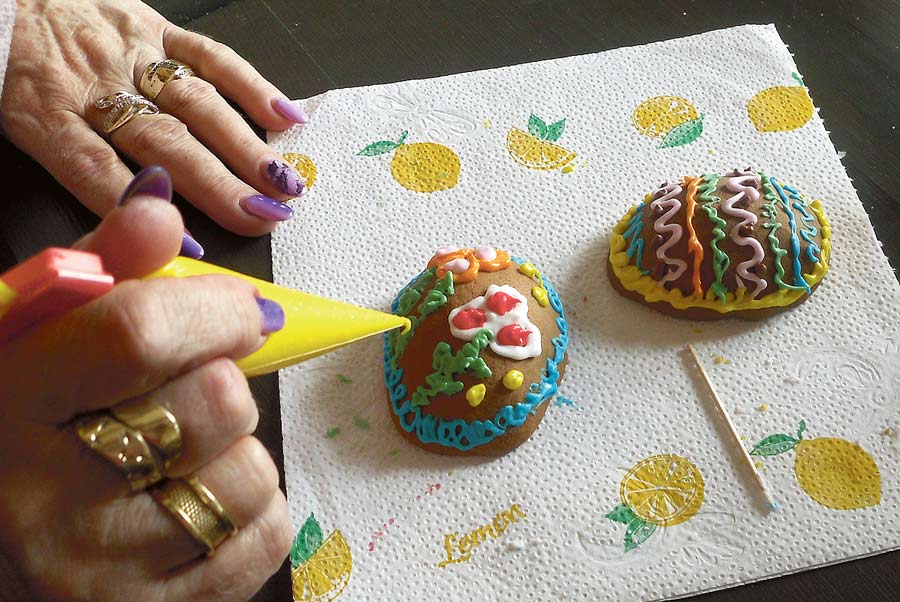 Stroik zawierał piernikowy talerzyk, na którym stał zając oraz pisanki 3D, malowane lukrem w wiosennych kolorach. Ozdabianie lukrem wymagało od uczestników warsztatów wielkiej precyzji i pomysłowości, co wcale nie było takie łatwe. Całością warsztatów kierowała Anna Rymkiewicz z „Kresowych Pierników”.