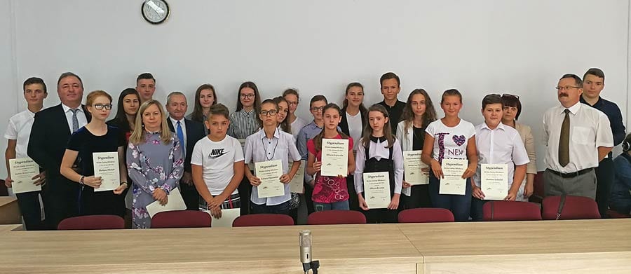 Podczas spotkania wręczono stypendia wójta za wysokie wyniki w nauce osiągnięte w roku szkolnym 2017/18. Stypendia w formie nagrody pieniężnej otrzymało 25 uczniów: 6 ze szkół podstawowych i 19 z gimnazjum. (a)