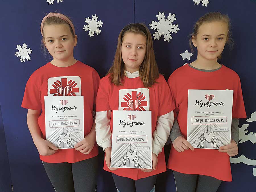 Liczące 60 uczniów z klas I-VIII Koło Caritas przy Szkole Podstawowej w Wierzbicy zdobyło drugie miejsce w Konkursie szkolnych kół Caritas „Cztery razy Wy!”, organizowanym przez Caritas Archidiecezji Lubelskiej. Doceniono najaktywniejsze wolontariuszki: Julię i Maję Balcerek oraz Annę Łozę, które otrzymały wyróżnienie Wolontariusza Roku 2021.