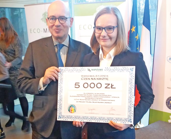Główne zadanie konkursowe polegało na zaproponowaniu zmian w najbliższej przestrzeni publicznej – w szkole, świetlicy, domu kultury. Zespół uczniów z I LO w Krasnymstawie w składzie: Katarzyna Dudek (I B), Karolina Kowalska (I C) i Aleksandra Manachiewicz (I B), opracował projekt muralu z wizerunkiem patrona szkoły – Władysława Jagiełły. Projekt został wyróżniony nagrodą specjalną za kreatywne spojrzenie na temat konkursu „Zakręceni w przestrzeni”. 8 listopada Katarzyna Dudek (lider zespołu) i nauczyciel nadzorujący przebieg pracy Anna Chmielewska, odebrały nagrodę (5 tys. zł) w Ambasadzie Francji w Warszawie, którą wręczył ambasador Francji Pierre Lévy. (k)
