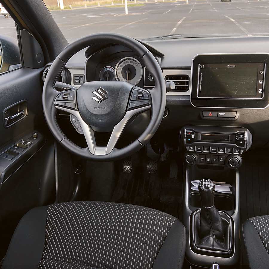 Nieźle prezentuje się obszyta skórą kierownica oraz zestaw zegarów widoczny za nią. Mały obrotomierz, centralnie umieszczony, duży prędkościomierz i wyświetlacz komputera pokładowego po prawej ich stronie może nie wyglądają nowocześnie i świeżo (brak kolorów), ale są niezwykle przejrzyste i czytelne. Miejsca w Ignisie jest wystarczająco dużo dla czterech osób, choć te zajmujące miejsca na tylnej kanapie na nadmiar komfortu raczej nie będą się uskarżać.