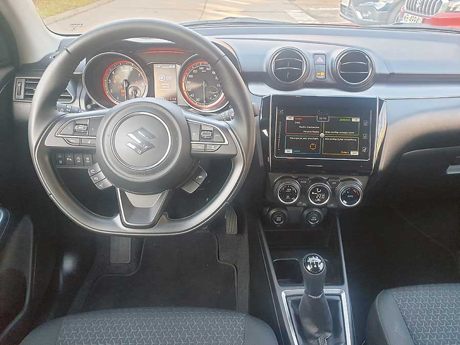 Nowoczesna, trójramienna kierownica, klasyczne zegary, duży wyświetlacz to na pewno jego atuty. Miejsca w Swifcie tradycyjnie jest całkiem sporo. Na fotelach wygodnie usiądą nawet koszykarze, z tyłu jest nieco ciaśniej, ale i tak dwie dorosłe osoby powinny zająć w miarę komfortową pozycję. Bagażnik ma pojemność 265 l. Ergonomia stoi – jak to w Suzuki – na najwyższym poziomie, ale z jednym wyjątkiem. Otóż kierowca, stojąc pod sygnalizatorem jako pierwszy, nie widzi świateł. By stwierdzić czy mamy zielone czy czerwone, trzeba bardzo mocno się wychylić.