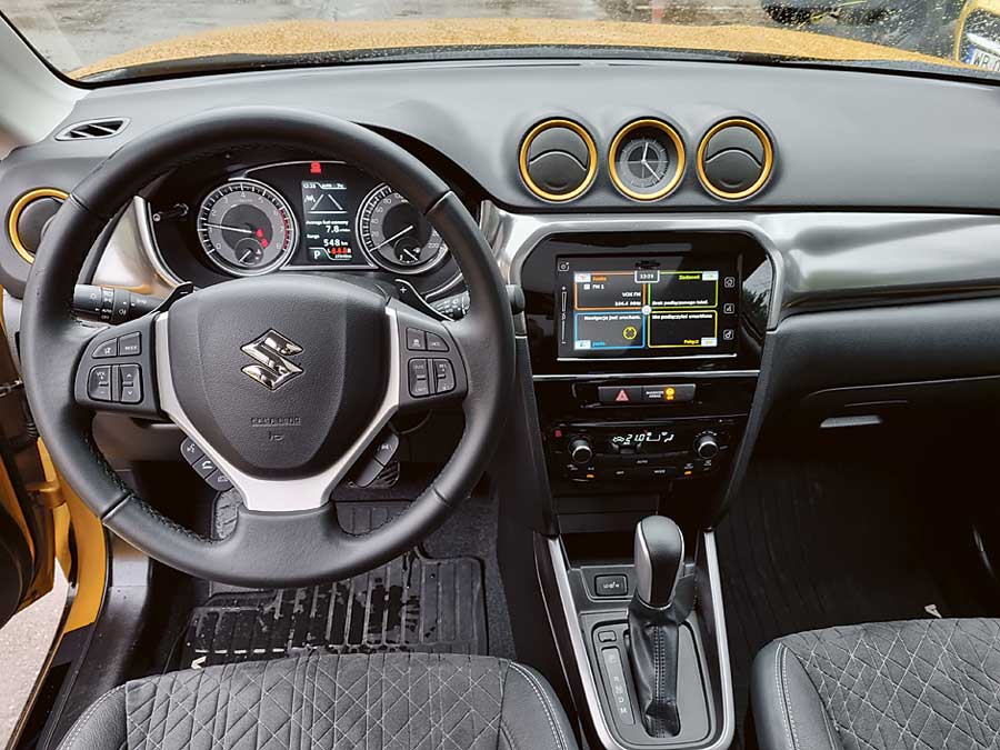 Wnętrze Vitary jest ciemne, ale wykonane z niezłych materiałów. Rozświetlają je wstawki w kolorze nadwozia wokół nawiewów powietrza czy na boczkach drzwi. Deska rozdzielcza wygląda prosto i atrakcyjnie, nie jest przeładowana nadmierną liczbą przycisków i wszystko obsługuje się intuicyjnie. Fotele nie są jakieś superwygodne, ale też i nie powodują bólu pleców nawet po dłuższej podróży. Miejsca na tylnej kanapie za wiele nie ma, szczególnie na nogi, ale w tym segmencie to akurat nie powinno dziwić. Bagażnik ma pojemność 365 litrów.