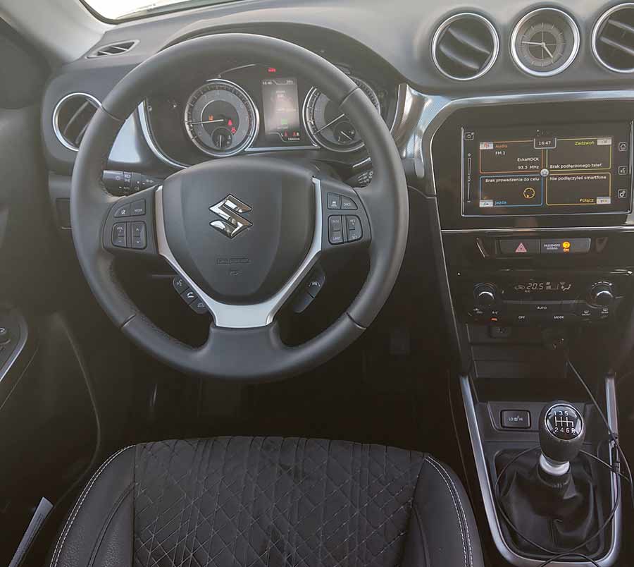 Ciekawostką jest analogowy zegarek umieszczony pomiędzy wylotami nadmuchu, który pierwotnie wyskalowano w języku Kraju Kwitnącej Wiśni, a po kuracji odświeżającej liczby zastąpiły czytelne dla wszystkich kreski. Kabina Vitary jest ciemna, ale wykonana z niezłych materiałów. Deska rozdzielcza wygląda prosto i atrakcyjnie, nie jest przeładowana nadmierną liczbą przycisków i wszystko obsługuje się intuicyjnie. Fotele mają duży zakres regulacji i są całkiem wygodne. Bagażnik ma pojemność 375 litrów.