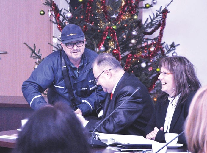 (21 grudnia) Przedświąteczna sesja Rady Miejskiej we Włodawie poświęcona była przede wszystkim uchwaleniu budżetu na 2017 r. Interpelacji było jak na lekarstwo, zaś po sesji były życzenia, kolędy i poczęstunek przygotowany przez Koło Gospodyń Miejskich „Zosie Samosie”. – Jedzonko pyszne – chwalili wspólnie radni i goście. Miłym zakłóceniem sesji była też wizyta na sali obrad… listonosza, który doręczył list polecony radnemu. Radni nagrodzili listonosza gromkimi oklaskami za staranność i konsekwencję.