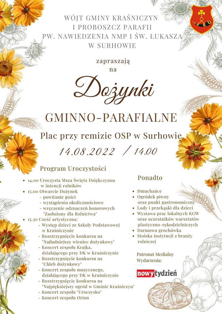 Również 14 sierpnia, o godz. 14.00 rozpoczną się dożynki w gminie Kraśniczyn. Rolnicy z tej gminy będą świętować w Surhowie przy remizie Ochotniczej Straży Pożarnej (program dożynek na plakacie). Wydarzenie odbędzie się pod patronatem Nowego Tygodnia.