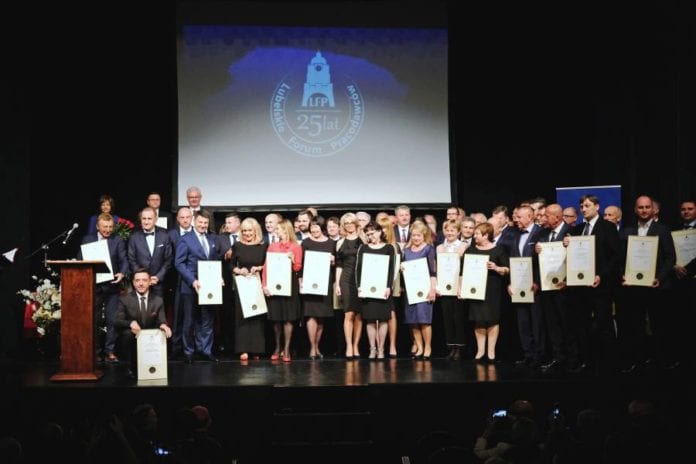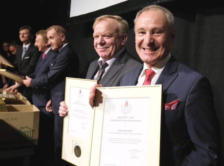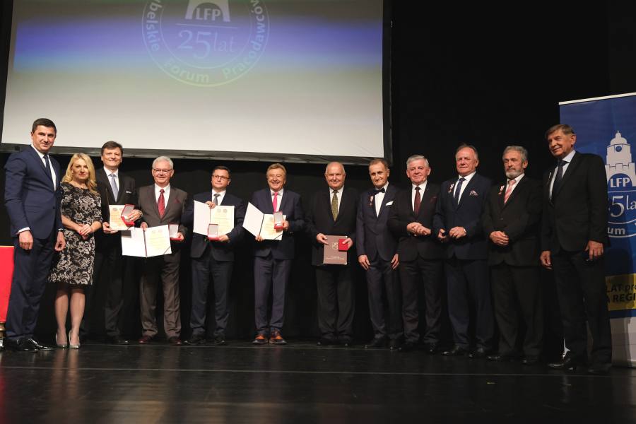 W programie było również wręczenie „Medali XXV-lecia LFP” przedstawicielom 77 firm członkowskich Lubelskiego Forum Pracodawców. Tak też się stało. Niemała scena teatru z trudem mieściła wszystkich wyróżnionych tego wieczora, nie tylko przedsiębiorcy. Medale LFP otrzymały także doceniane przez Forum osoby, spoza branży. Są to m.in. arcybiskup Stanisław Budzik i arcybiskup prawosławny Abel, wojewoda lubelski (medal przekazano na jego ręce przedstawicielki), marszałek województwa, prezydent miasta, rektorzy UMCS, UM, PL, KUL, zakonnik Filip Buczyński, Jan Karwański – dyrektor PKO BP Lublin, Wojciech Pietras (Santander Bank Polska), Mirosława Gałan – (Loża Lubelska BCC), Dariusz Jodłowski – (Lewiatan), a nawet Ambasador Peru w Polsce, z którym LFP utrzymuje stałe kontakty – medal odebrała jego asystentka, w zamian wręczając gospodarzom list gratulacyjny ambasadora z okazji Jubileuszu.