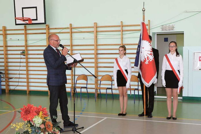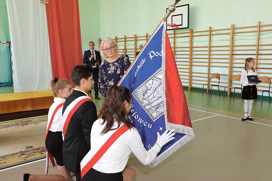 10 września odbyła się uroczysta wymiana i poświęcenie nowego sztandaru. To dla każdej szkoły a także całej społeczności lokalnej wyjątkowe święto. – Obecni byli na nim przedstawiciele rady rodziców, pracowników szkoły, uczniów, kuratorium oświaty oraz władz naszego miasteczka a patronat honorowy nad uroczystością objął burmistrz, Tadeusz Górski – mówi dyrektor Królicka.