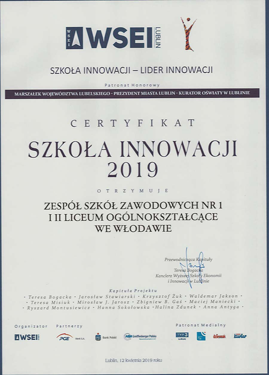 Zespół Szkół Zawodowych Nr 1 i II Liceum Ogólnokształcące we Włodawie to szkoła wyróżniająca się innowacyjną postawą w nauczaniu oraz współpracą z otoczeniem społeczno-gospodarczym. Potwierdzeniem tego jest przyznanie placówce certyfikatu „Szkoła Innowacji”.