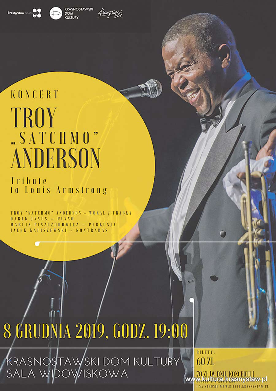 Bilety na koncert w cenie 60 zł (70 zł w dniu koncertu) można nabyć w kasie KDK i na www.bilety.krasnystaw.pl. Troy „Satchmo” Anderson to wokalista i trębacz z Florydy, wierna kopia Louisa Armstronga, który nie tylko gra i śpiewa tak jak legendarny oryginał, ale jeszcze w dodatku jest do niego łudząco podobny.