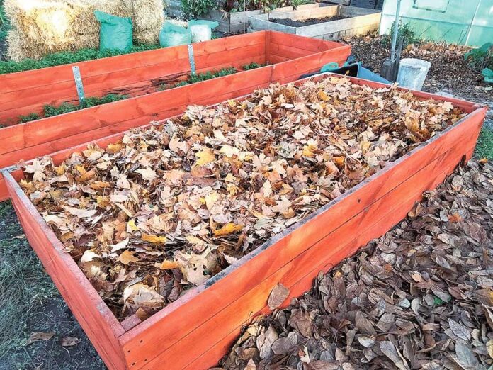Grządka podwyższona z rozkładającymi się liśćmi, które użyźnią ziemię