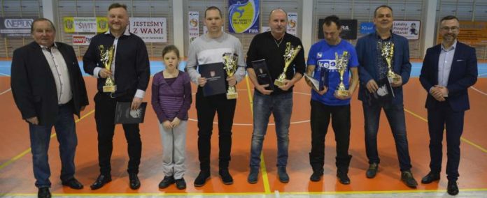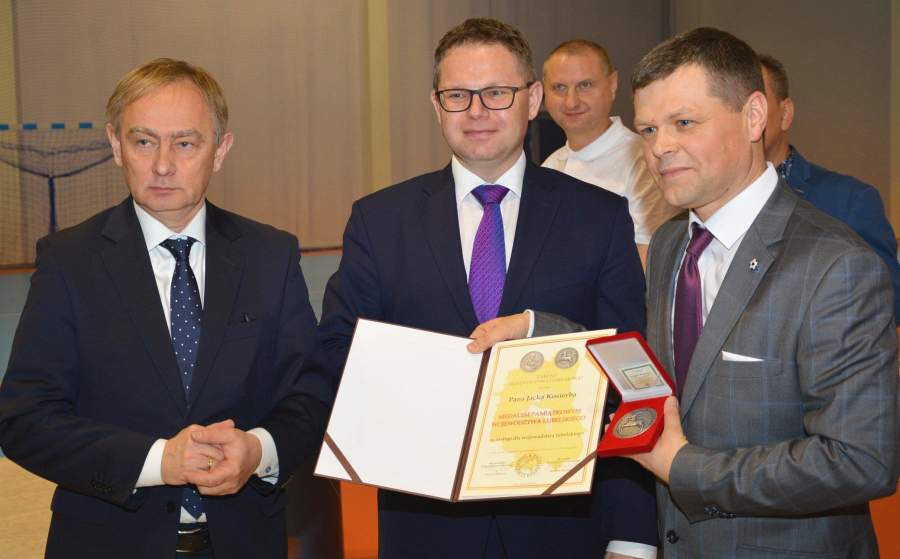 Jacek Kosierb (z prawej), organizator Powiatowej Amatorskiej Ligi Futsalu, odebiera z rąk Andrzeja Miskura, dyrektora Departamentu Kultury, Edukacji i Sportu Urzędu Marszałkowskiego oraz Michała Piotrowicza, radnego Sejmiku Województwa Lubelskiego, Medal Pamiątkowy Województwa Lubelskiego, przyznany przez Jarosława Stawiarskiego, marszałka województwa. Wyróżnienia otrzymali także: Barbara Karaś, Romuald Parczyński, Piotr Gorzkowski, Adam Kontnik i Ireneusz Dyl.