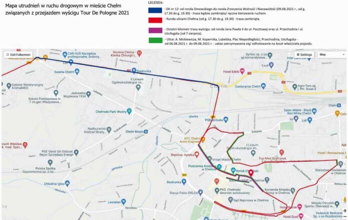 W sobotę, 7 sierpnia, z ruchu całkowicie wyłączony zostanie kilometrowy odcinek finiszu trasy wyścigu od ronda im. Jana Pawła II do końca ul. Lubelskiej przy PWSZ, który będzie wyznaczony specjalnymi płotkami. Ratusz informuje, że zamknięcie odcinka w sobotę spowodowane jest przygotowaniami organizatora wyścigu. W tym czasie dojazd do posesji znajdujących się na tej trasie będzie zapewniony wyłącznie dla osób mieszkających w jej obrębie. Będzie to jednak możliwe jedynie do dnia wyścigu, czyli 9 sierpnia, do godziny 16.30, kiedy trasa zostanie całkowicie zamknięta. Pojazdy z zaopatrzeniem będą mogły wjechać w zamkniętą strefę jedynie w sobotę. 9 sierpnia, czyli w dniu wyścigu, w godzinach 17.30-19.30 całkowicie wyłączony z ruchu zostanie odcinek będący trasą przejazdu zawodników. W tym czasie policja i służby porządkowe, będą kierować ruchem ręcznie, dlatego urzędnicy apelują do chełmian o stosowanie się do wszystkich komunikatów i zaleceń funkcjonariuszy.