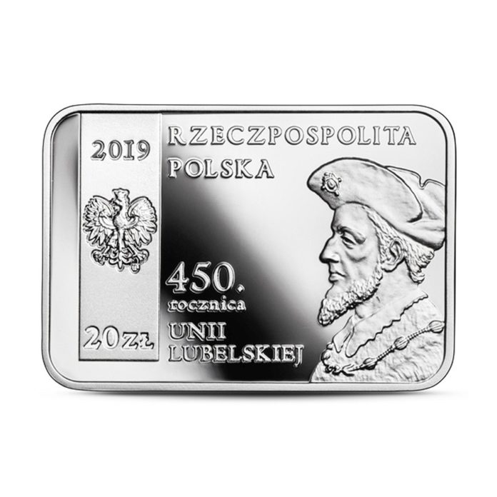 Na awersie monety został umieszczony wizerunek króla Zygmunta II Augusta według Jana Matejki. Na rewersie znajdują się: herb Zygmunta II Augusta, cytat z dokumentów sejmu unijnego: „Wolni do wolnych, równi do równych” oraz fragment obrazu Marcella Bacciarellego „Unia lubelska”. Srebrna moneta upamiętnia obchodzoną w tym roku 450. rocznicę unii lubelskiej.