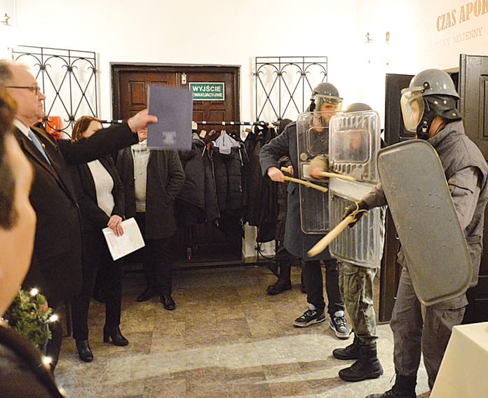 Obchody rozpoczęło otwarcie wystawy „Czas apokalipsy. Stan wojenny 1981-1983” autorstwa IPN oraz kolekcji pamiątek ze stanu wojennego ze zbiorów Norberta Wojciechowskiego i Mieczysława Tokarskiego. Tego dnia złożono także wiązanki kwiatów pod tablicą internowanych przed ZK we Włodawie oraz na grobach działaczy NSZZ „Solidarność” Ziemi Włodawskiej. Po południu w budynku administracyjnym Muzeum swoje krótkie wspomnienia prezentowali trzej internowani z Włodawy: prof. Józef Fert, Zdzisław Kociubiński i Wojciech Zając. – Po wypuszczeniu mnie z więzienia, z internowania łaskawie pozwolono mi wrócić do nauczania – mówił prof. J. Fert, wspominając 1982 rok. – Zaproponowano mi, wówczas doktorowi, prace w szkole specjalnej, spodziewając się, że oczywiście odmówię. Jednak, ku zdumieniu komunistów, zgodziłem się z radością. To ich tak zdenerwowało, że jednak pozwolono mi wrócić do liceum, jedynie pozbawiając wychowawstwa. Wspomnień i wystawie przyglądało się kilkudziesięciu przybyłych gości, w tym m.in. starosta Andrzej Romańczuk i burmistrz Wiesław Muszyński. Wcześniej scenkę pacyfikacji muzeum przez ZOMO odegrała ambitna młodzież pod kierunkiem Bogusława Smolika. Całość uroczystości zakończyła msza św. za Ojczyznę w kościele pw. św. Ludwika we Włodawie. (pk)