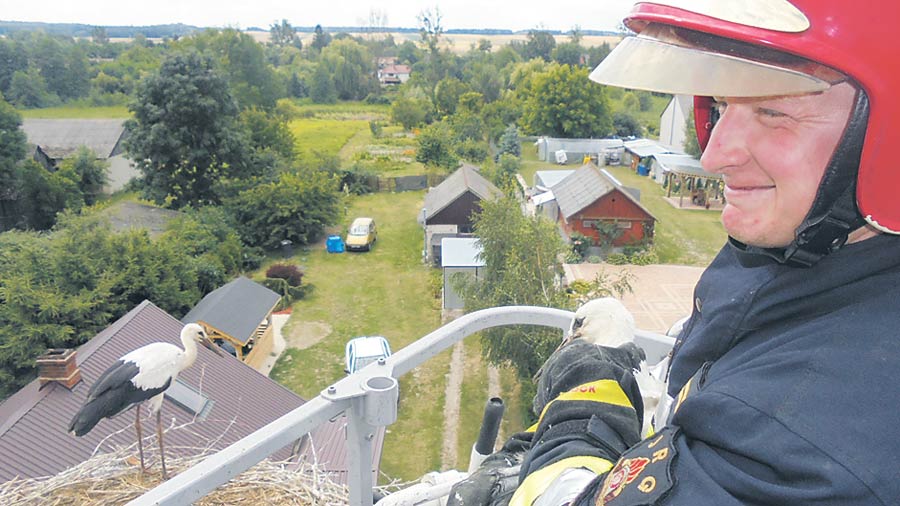 Okazało się, że z gniazda znajdującego się przy jednej z posesji wypadł bocian. Zwierzę było chyba w szoku, bo nie potrafiło samodzielnie wrócić do swojego domu. Na pomoc przyszli właśnie strażacy. Jeden z nich złapał bociana, wspiął się na drabinie i włożył nieszczęśnika do gniazda. – Bociek ma się dobrze, nic mu się nie stało – mówi Kamil Bereza, rzecznik krasnostawskiej straży pożarnej. (k)